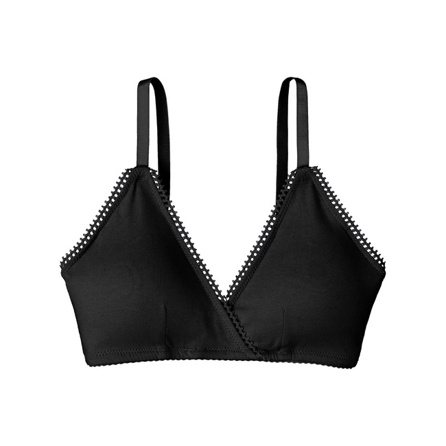 This bra is made for people that have not gone through chest development to start experimenting with shaping up top. The bra features a crossover design with scalloped edges and adjustable straps. A clasp is included for those that want to experiment with "putting on a bra". The straps are stretchy enough to allow the bra to be slipped over the head without unclasping. The bra includes a removable set of pads and will have extra room to allow for multiple pads.Â